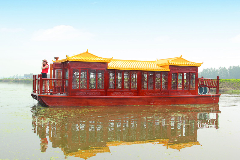 画舫船就是装饰古典华丽的游船,是"中国风"的仿古游船,结合古典园林建筑,体现了中华文明的古典艺术。仿古画舫游船的特点飞檐翘角、玲珑精致的四角亭子逐渐成形,赫然立于船头,美人靠、盘龙柱子、彩画……龙柱上的浮雕盘龙和祥云一层扣着一层,层层错落有致,雕刻精细到盘龙身上的每一个鳞片都细细可数,古代皇家标志性元素,在画舫船上体现的淋漓尽致。